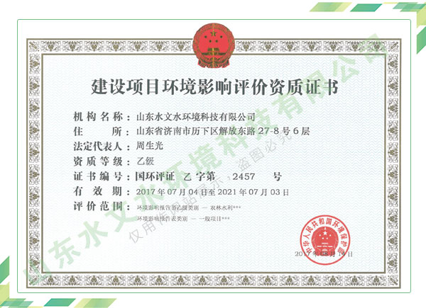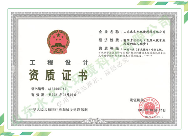 公司擁有水利工程設計、水土保持、水文水資源調(diào)查評價、水資源論證、建設項目環(huán)境影響評價、市政公用工程施工總承包、水利水電工程施工總承包、電子與智能化工程專業(yè)承包等資質(zhì),2017年通過質(zhì)量管理體系、環(huán)境管理體系、職業(yè)健康安全管理體系認證;2020年被評為國家級高新技術(shù)企業(yè),同年被中國水利企業(yè)協(xié)會推薦為第一批“合同節(jié)水服務企業(yè)”;2021年被山東省、濟南市評為 “專精特新”中小企業(yè)。業(yè)務范圍涉及水利工程設計;節(jié)水設計、改造、水平衡測試;山洪災害調(diào)查;城市水資源調(diào)查評價;建設項目水土保持方案編制、監(jiān)測、驗收、水土保持規(guī)劃;水安全保障規(guī)劃、建設項目水資源論證、規(guī)劃水資源論證;建設項目環(huán)境影響評價;入河排污口論證;防洪影響評價;市政公用工程施工、水利水電工程施工、電子與智能化工程施工等。